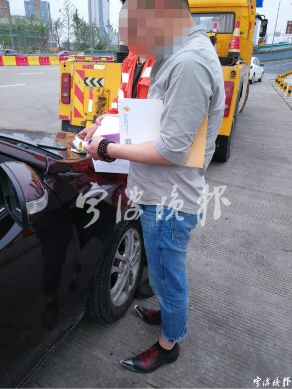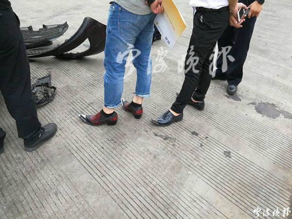 在宁波北收费站外广场,处理事故的交警无意间发现,其中一辆车的男驾驶员白某,脚上竟然穿了一双高跟鞋!!!